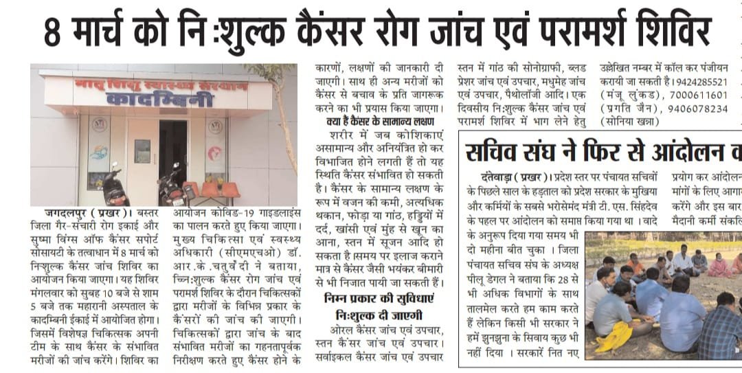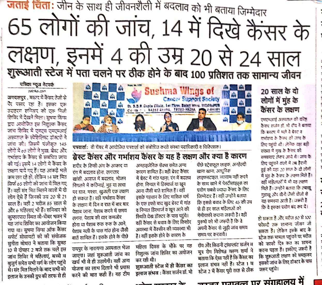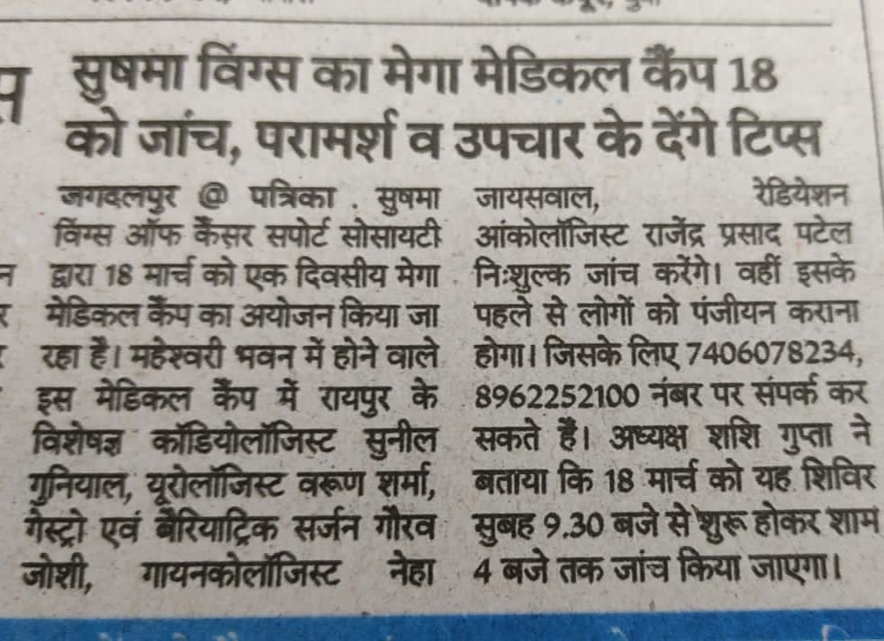 On January 4th, Sushma Wings hosted a seminar in Bastar, focusing on cancer awareness and the importance of early detection. The event aimed to educate the local community about cancer prevention and treatment options.