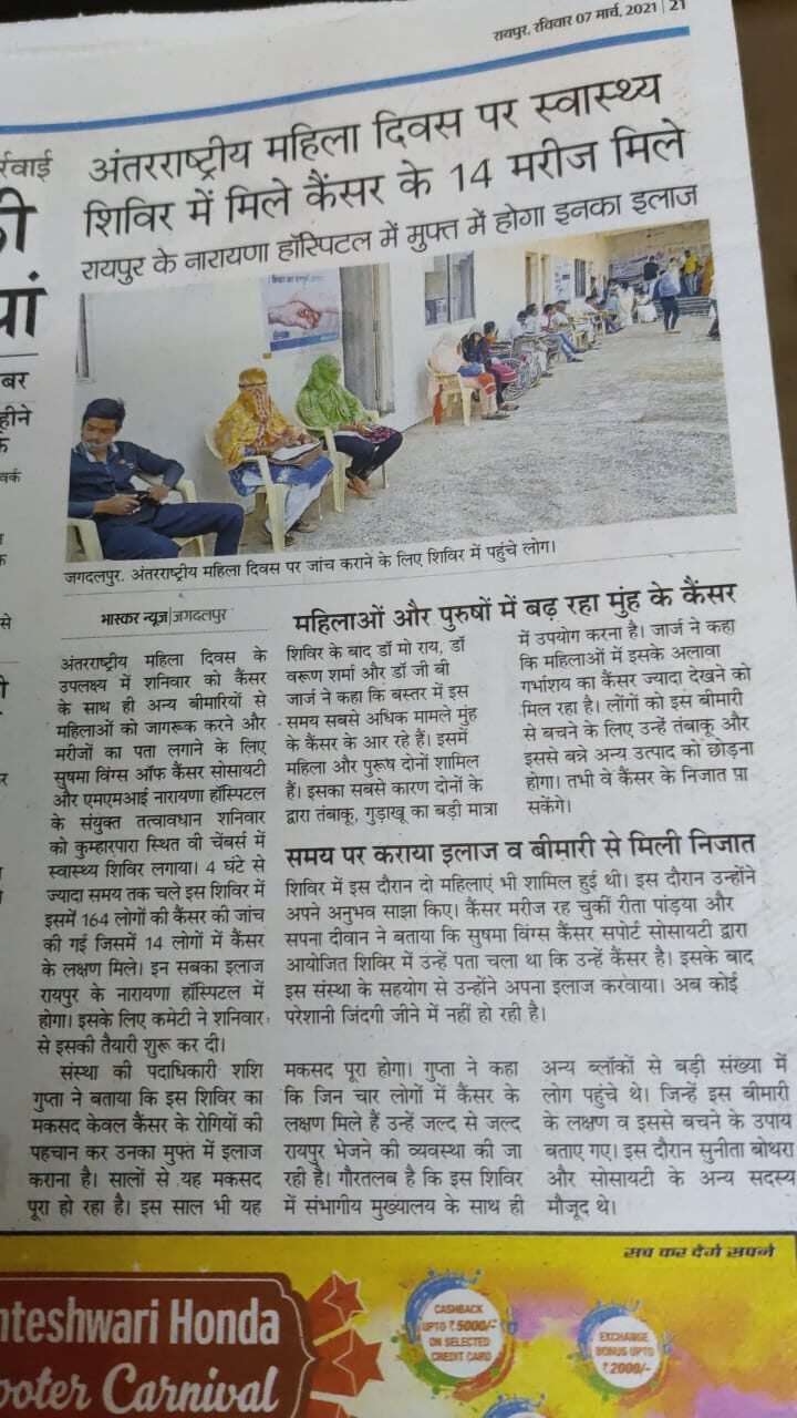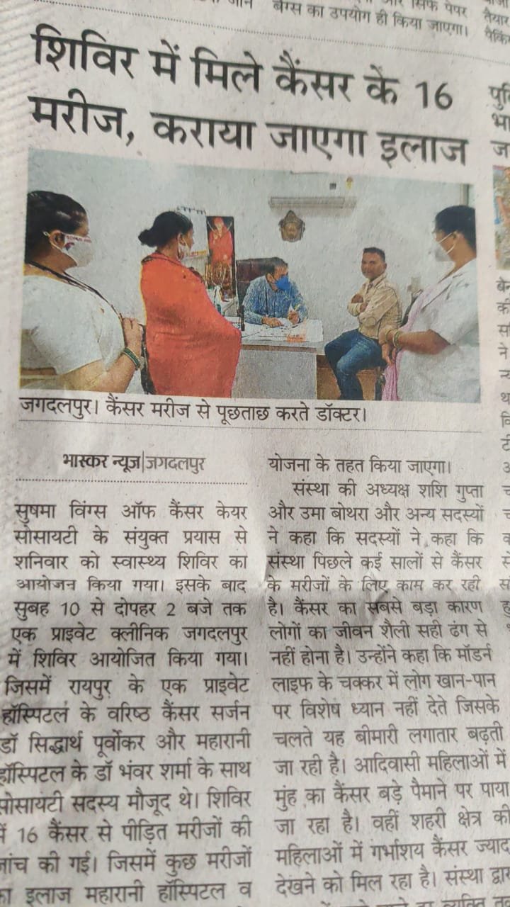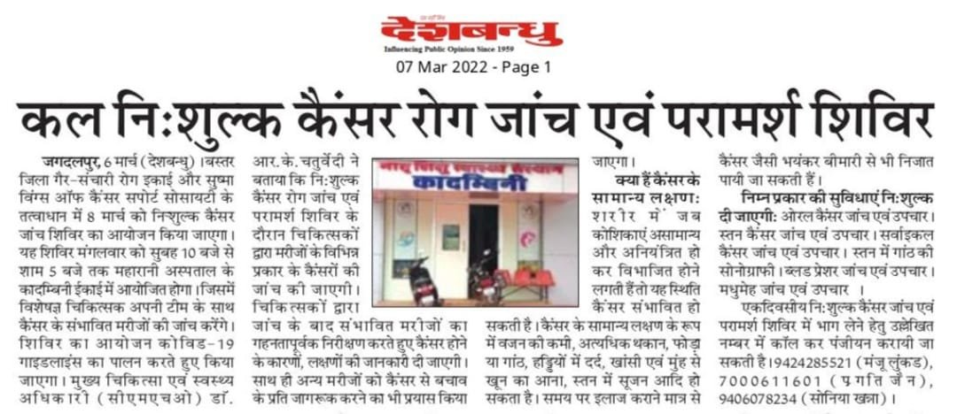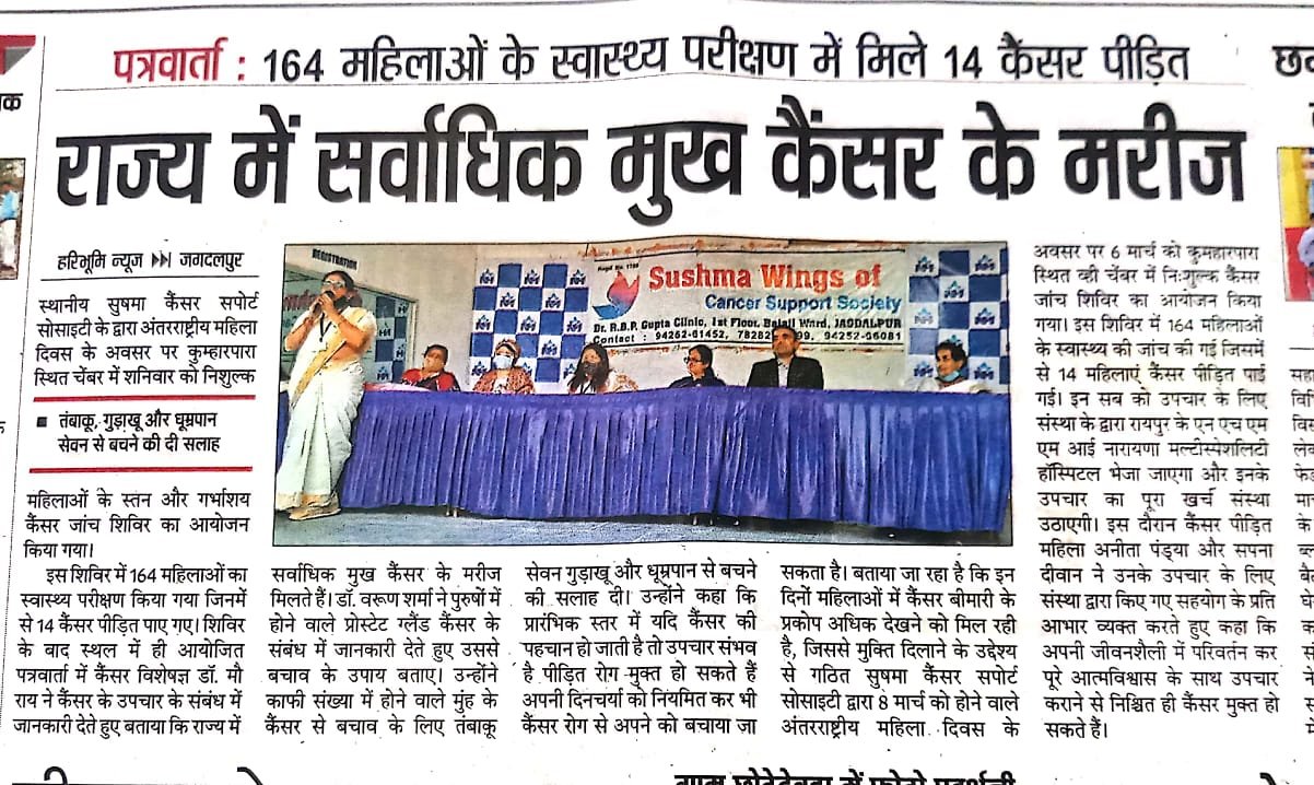 On October 14th, Sushma Wings hosted a seminar at Danteshwari Ward in Jagdalpur, aimed at increasing awareness about cancer prevention and providing information on support resources available to the community.