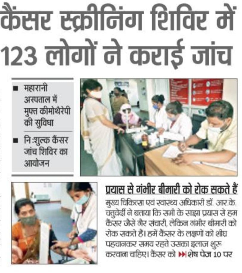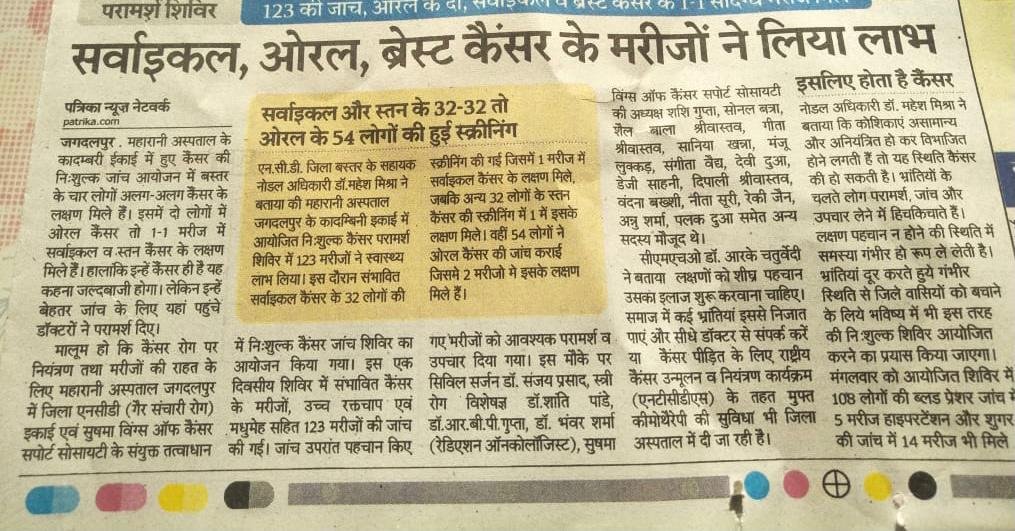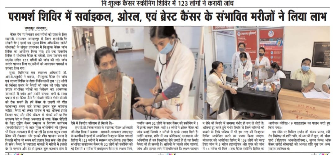A medical camp held on July 9th at Jila Hospital in Kondagaon saw 82 registrations and 35 PAP smears, detecting 15 cancer cases. The event was in association with BALCO, NCD Cell, and Dr. Bhawar Sharma.