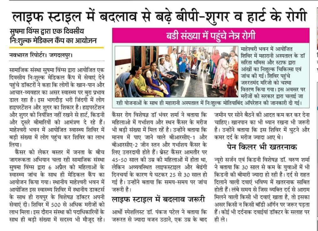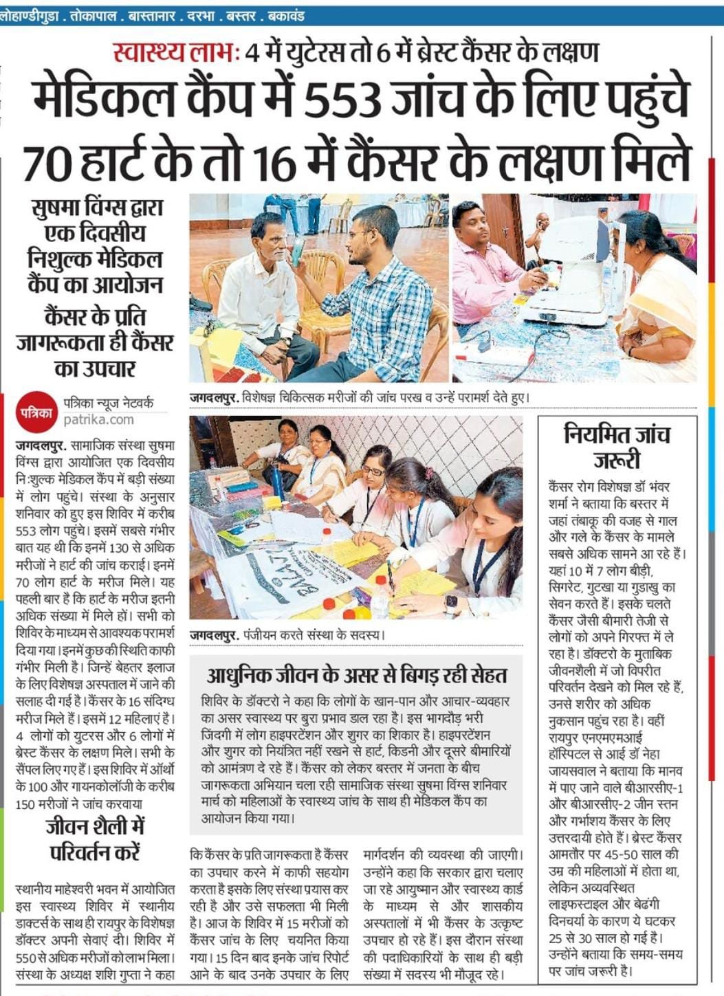 Sushma Wings held a medical camp in Bijapur, registering 717 attendees and conducting 46 PAP smears. Esteemed doctors from Raipur participated, offering essential healthcare services to the local population.